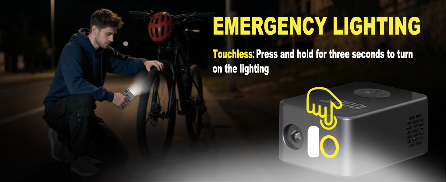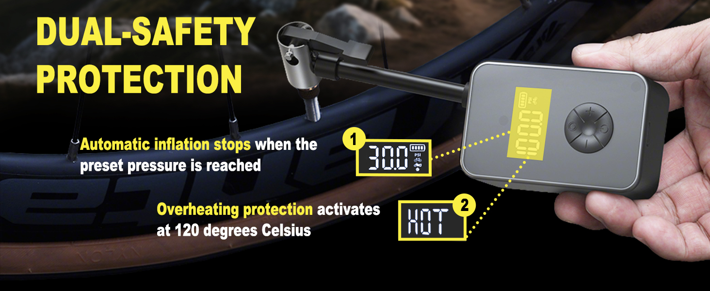 Dual Safety Protection: Small bike pump features a built-in overheat protection system, When operating for extended periods and reaching 120°C, the screen displays “HOT” and automatically pauses operation, resume use after cooling to extend the bike pump lifespan; Additionally, bike air pump is equipped with a high-brightness LED light, Press and hold for 3 seconds to activate, providing reliable illumination for nighttime repairs, cycling, or emergencies