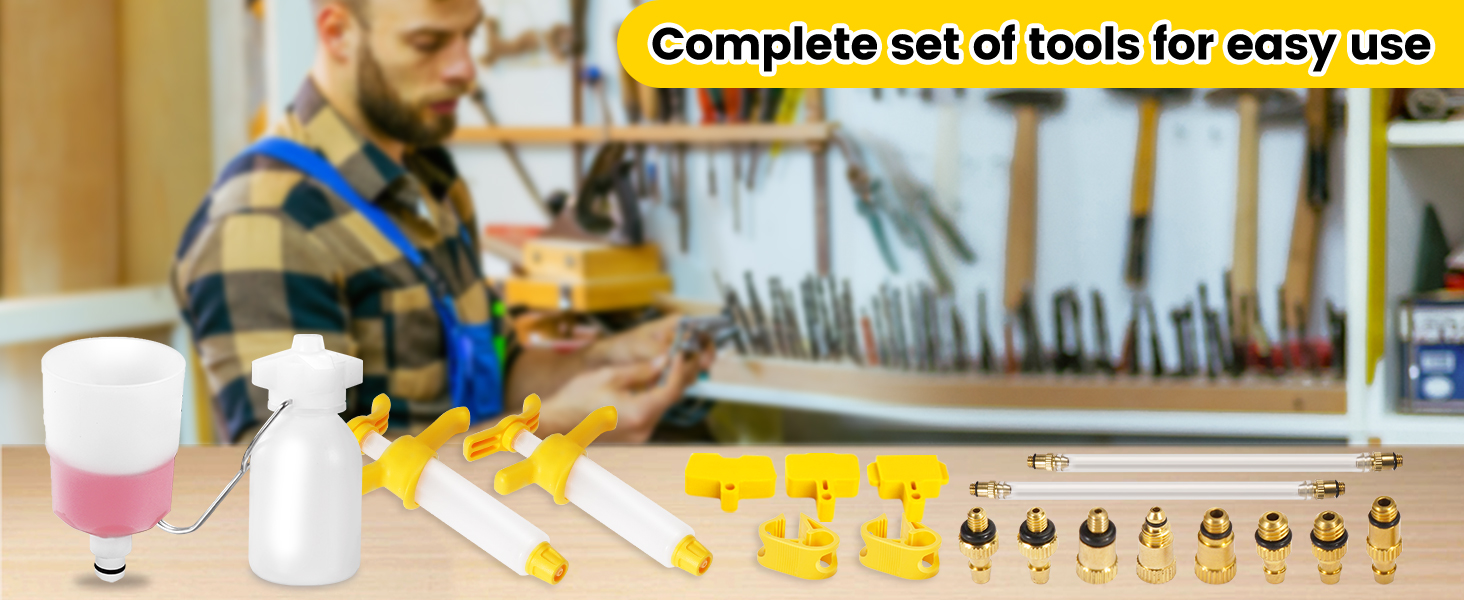 150ML Mineral oil, 1 Pair of gloves, 2 Hook and loop fasteners, Brass connector, 2 Bleed syringe, Transparent funnel.